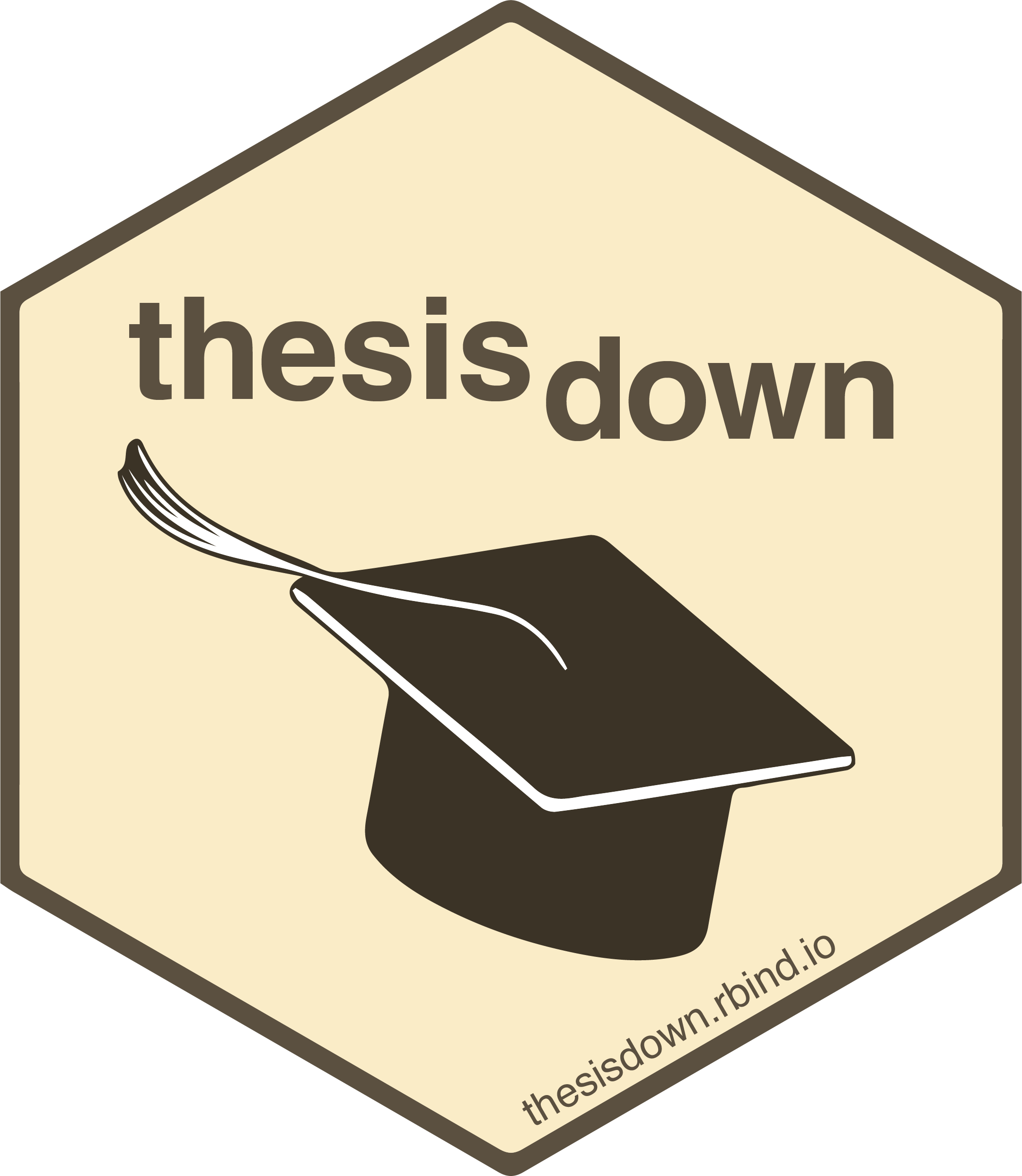 This project was inspired by the bookdown package and is an updated version of my Senior Thesis template in the reedtemplates package here. It was originally designed to only work with the Reed College LaTeX template, but has since been adapted to work with many different institutions by many different individuals. Check out the Customizing thesisdown to your institution section below for examples.